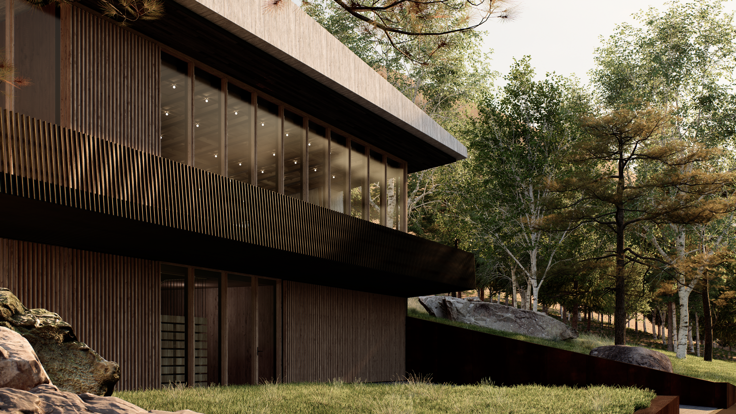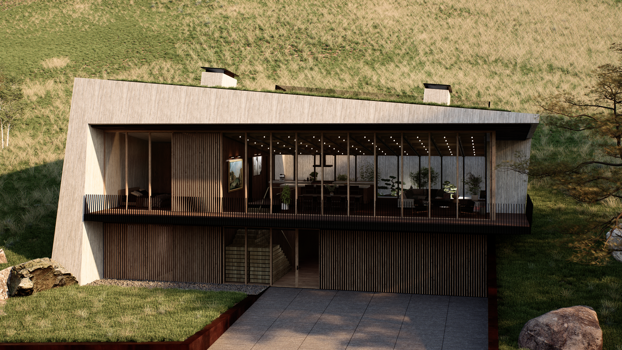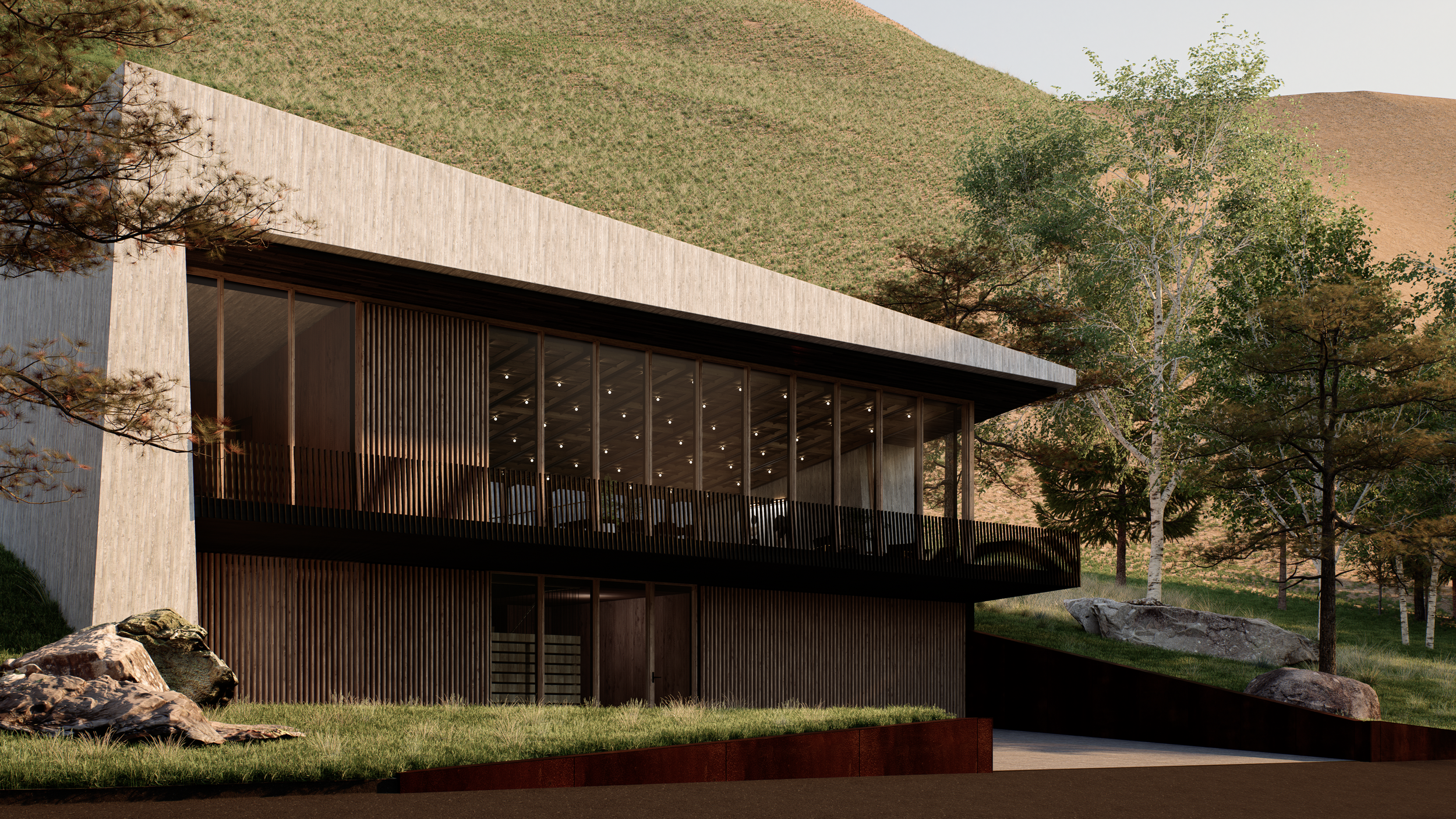 A generous central courtyard introduces natural light deep into the plan, alleviating the claustrophobia often associated with partially buried structures. Subtle site features in weathering steel further tie the home to the landscape.
