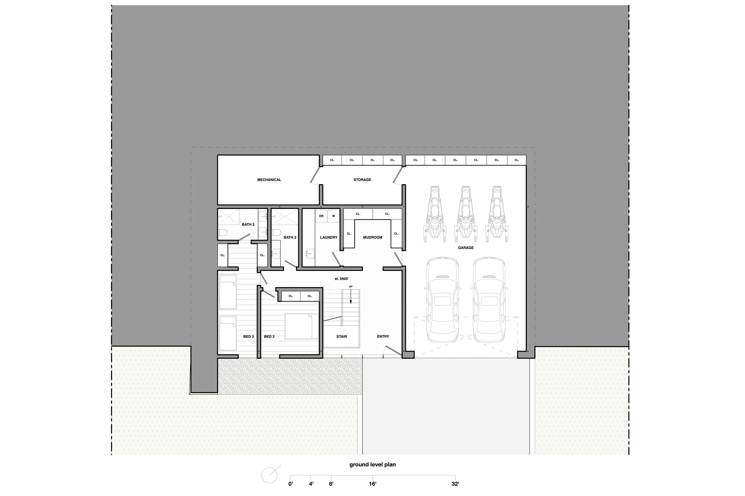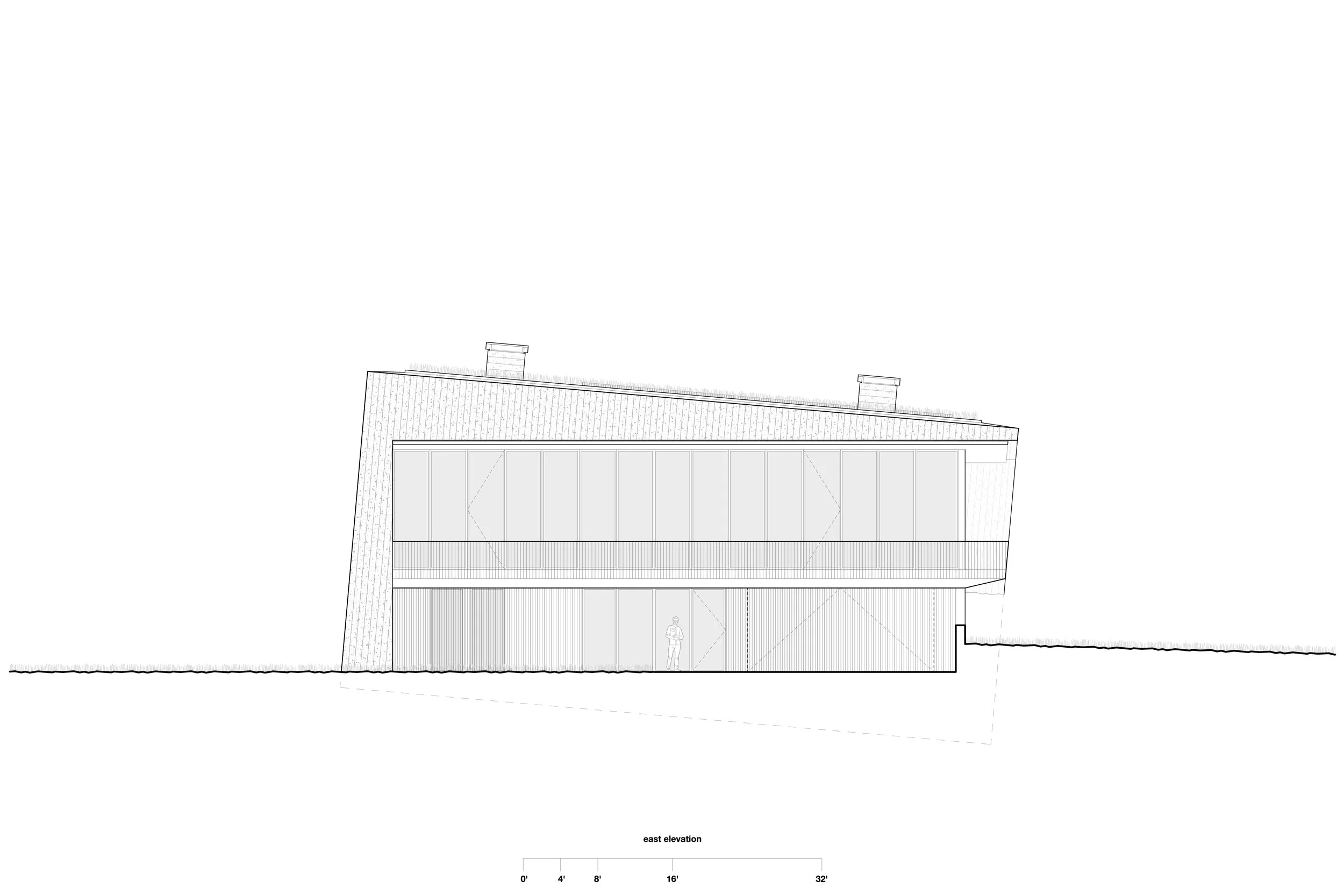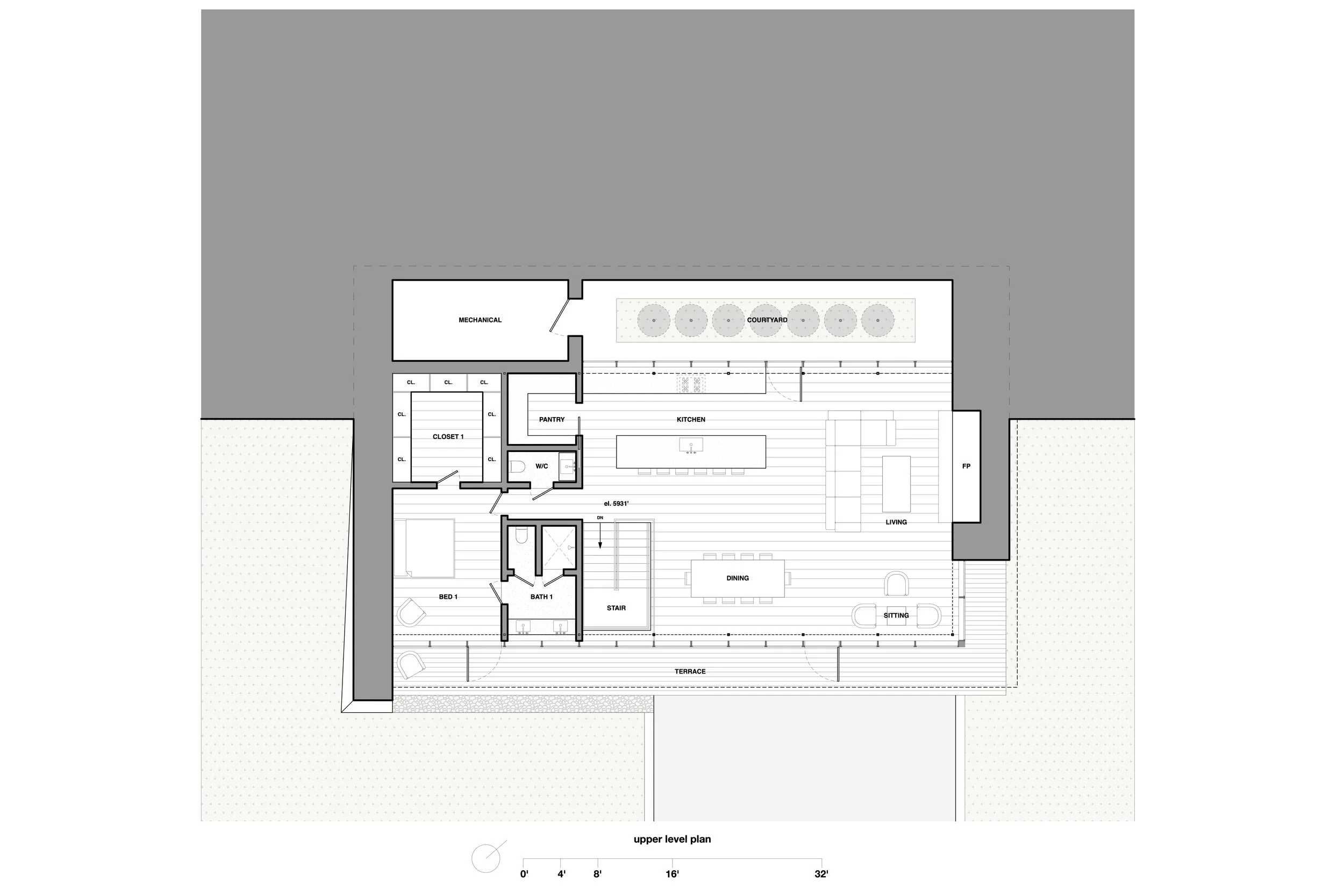 A generous central courtyard introduces natural light deep into the plan, alleviating the claustrophobia often associated with partially buried structures. Subtle site features in weathering steel further tie the home to the landscape.