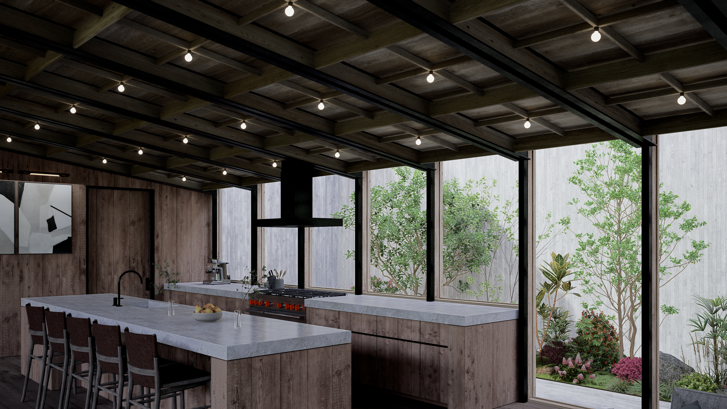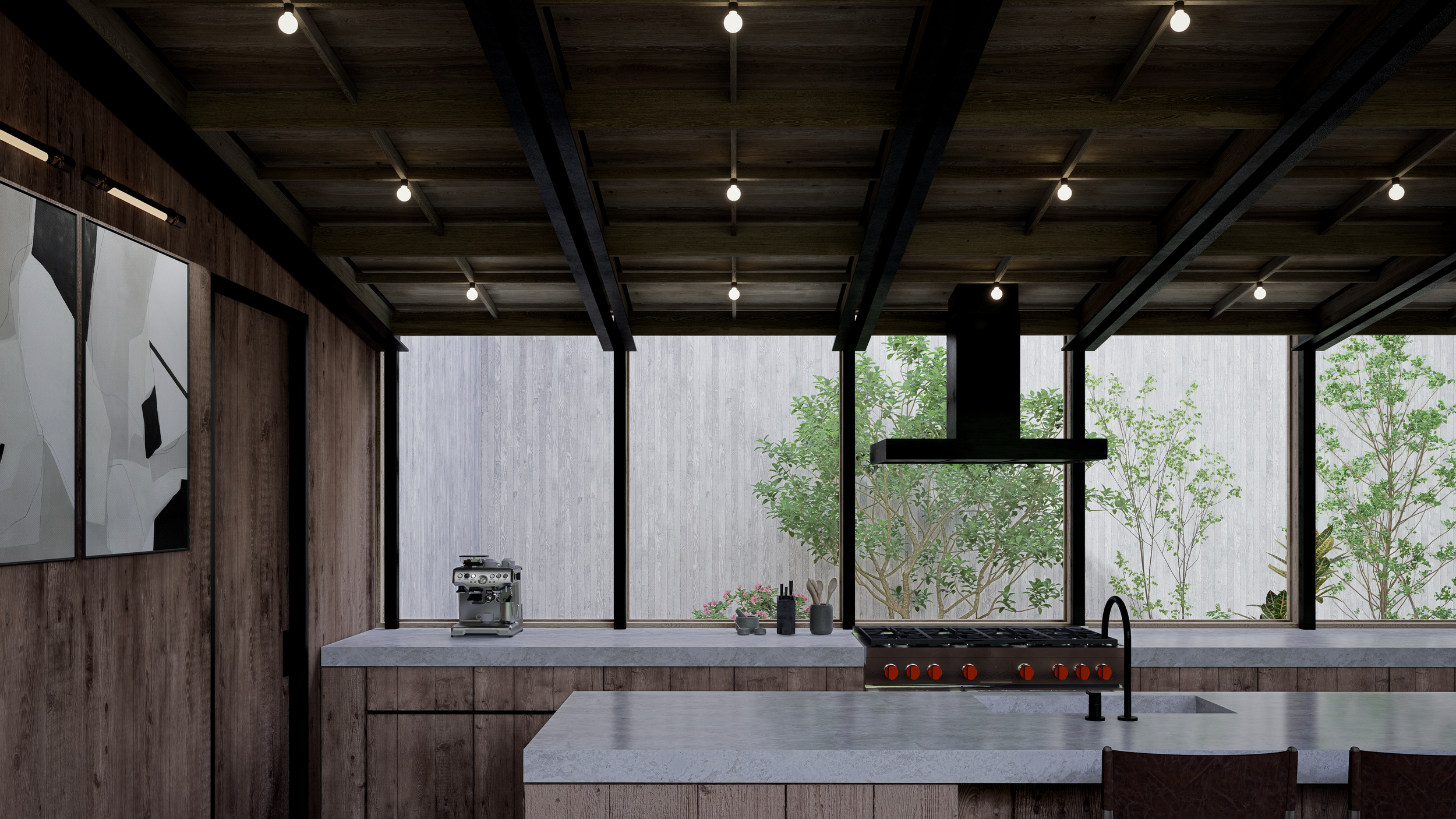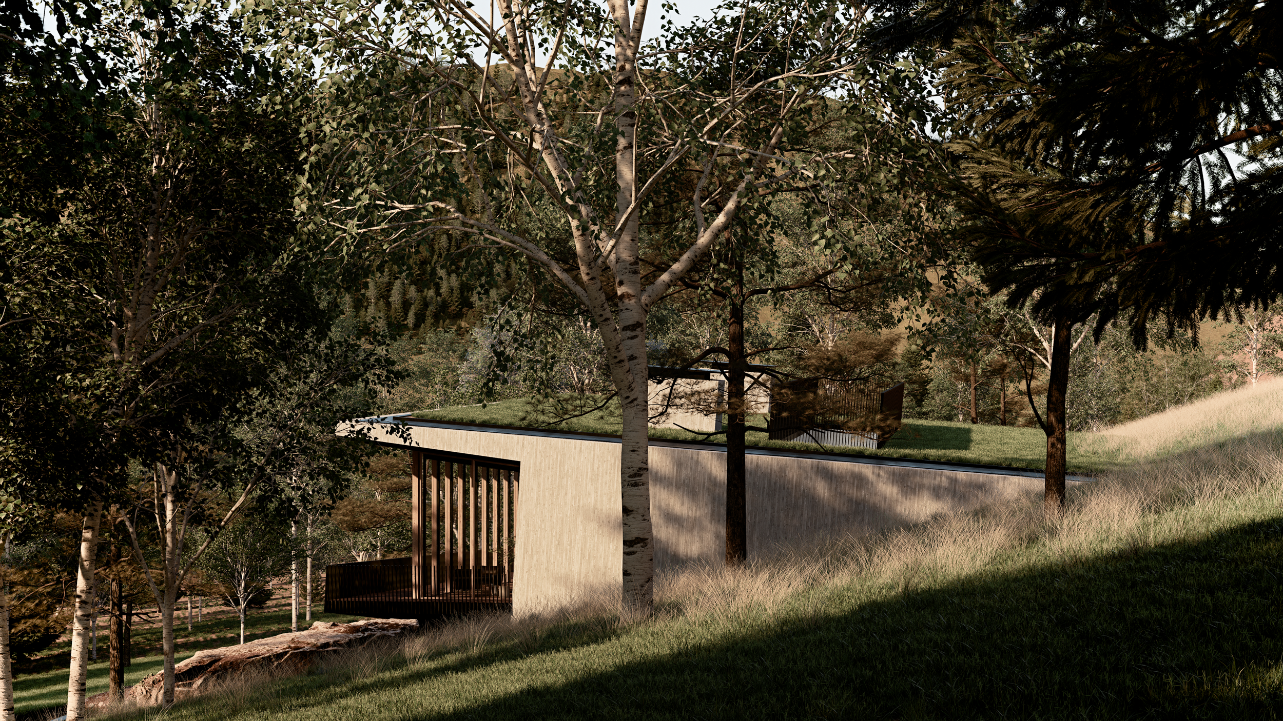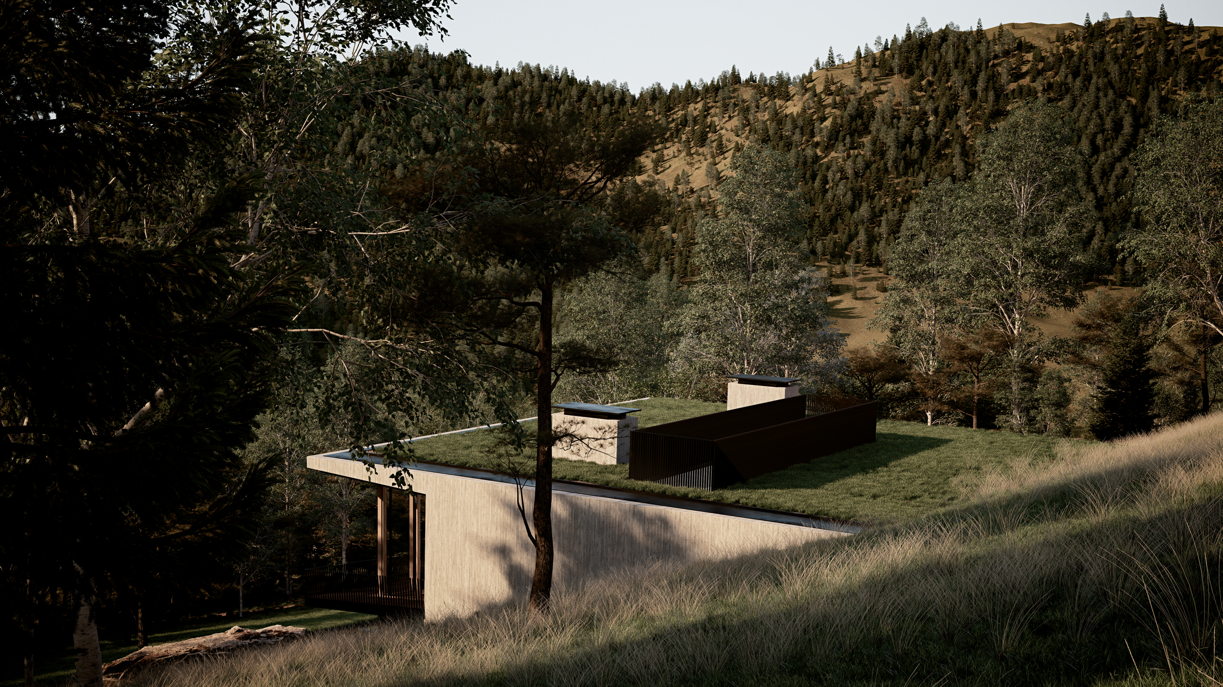 Board-formed concrete serves as the primary building material, selected for its strength against the region’s harsh climate and avalanche exposure, as well as for its rich, tactile texture. Inside, the geometry of the concrete shell is mirrored in a ceiling that slopes upward to frame expansive views over the valley. Warm wood finishes introduce contrast and intimacy, bringing a sense of comfort to the interiors. A central courtyard introduces natural light deep into the home, alleviating the claustrophobia often associated with partially buried structures.