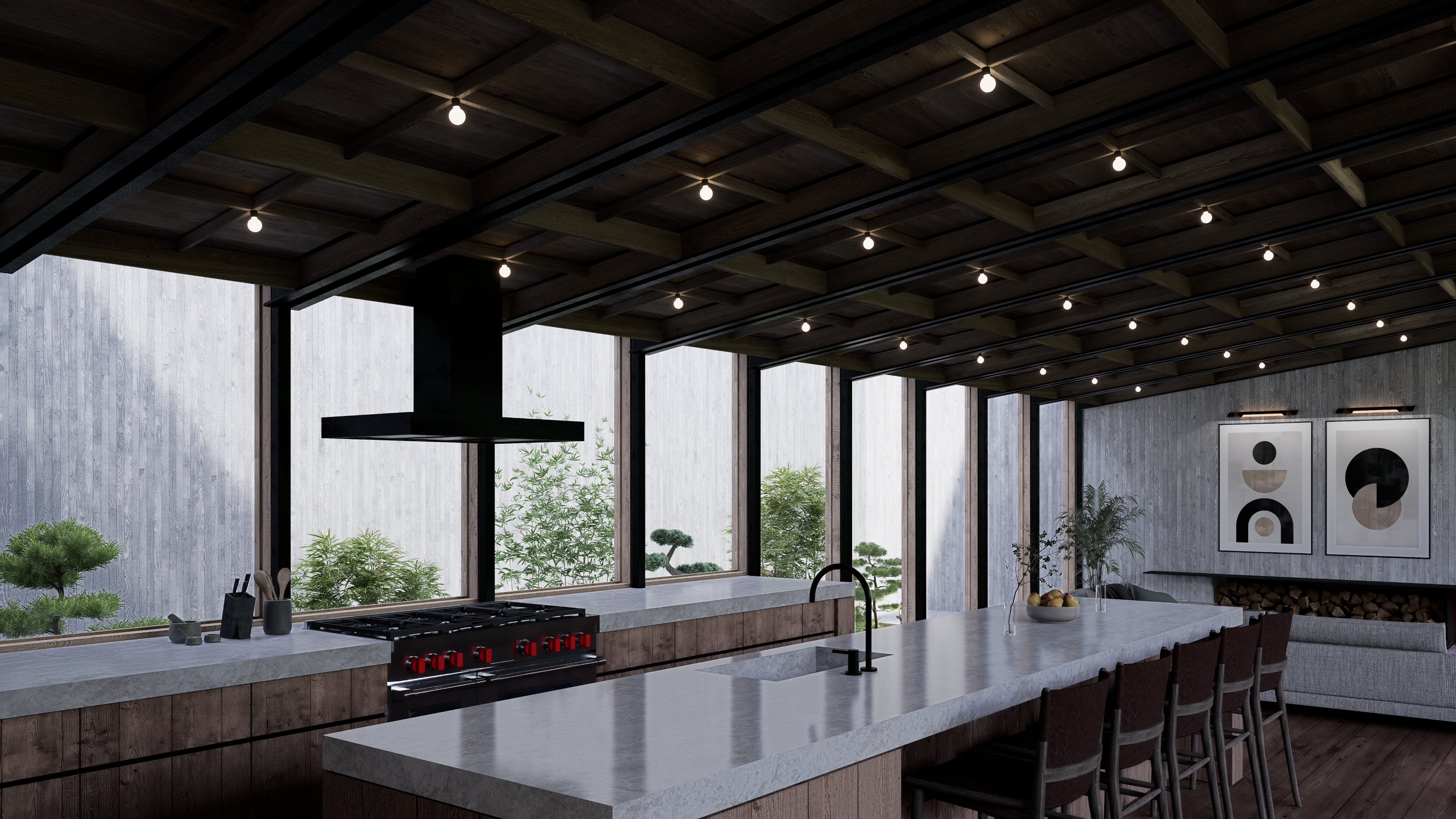 The kitchen embraces simplicity and light, designed without upper cabinets to maintain an open connection to the Japanese-inspired garden beyond. A concealed pantry supports this minimalist approach, keeping the space uncluttered and serene.