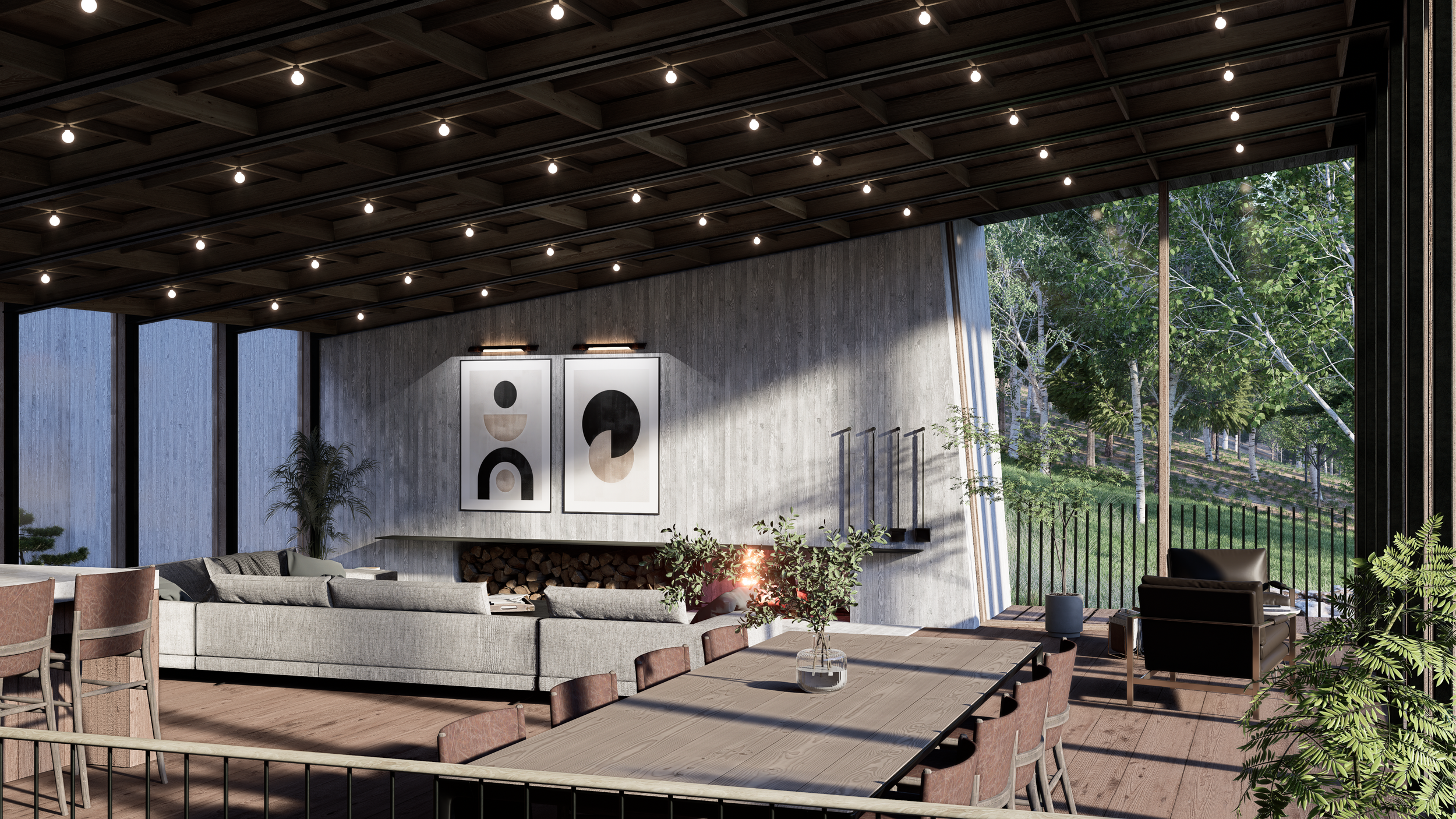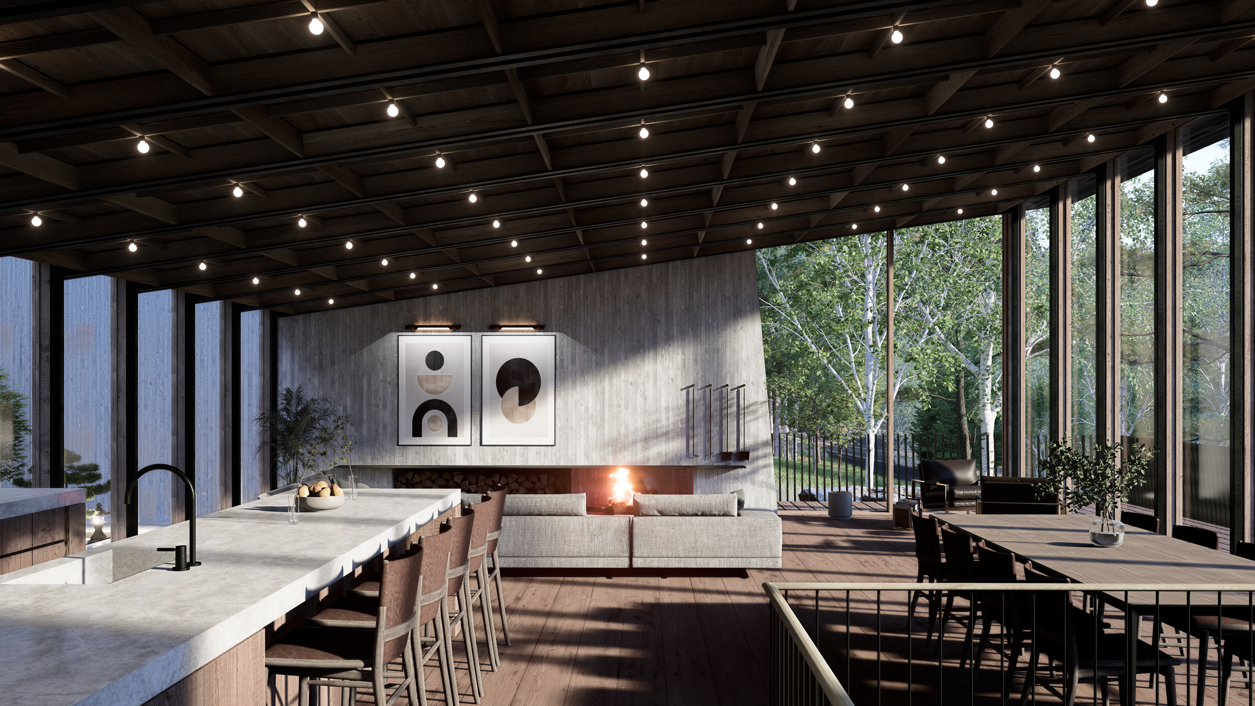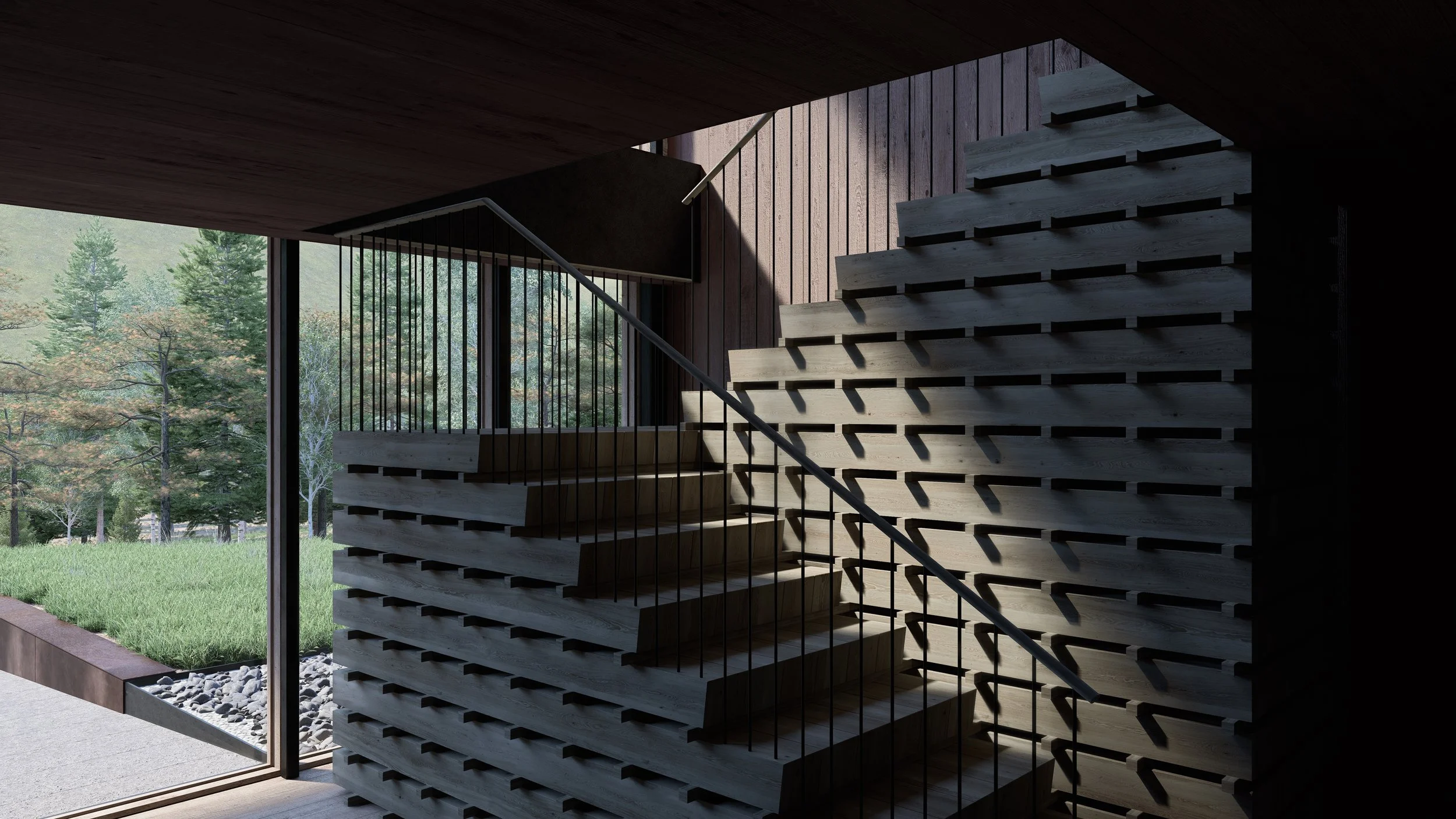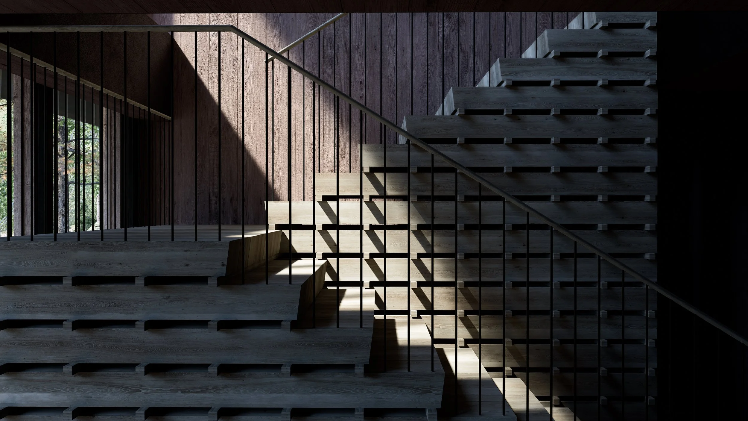 The central staircase—resembling a stacked pile of timbers—references historic mine shoring found throughout the region, grounding the project in its local context. On the exterior, a consistent rhythm of slender vertical elements unites wood slats and the blackened steel guardrail, reinforcing a cohesive architectural language.