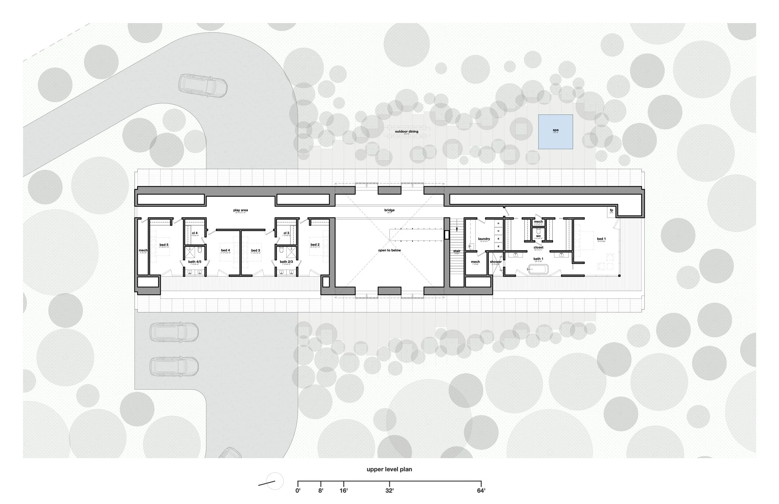 The second forms the great room — a double-height gathering space centered on a sculptural fireplace, with kitchen, dining, and living areas all arranged beneath generous skylights and expansive glazing. A wooden bridge crosses overhead, linking the upper-level wings.